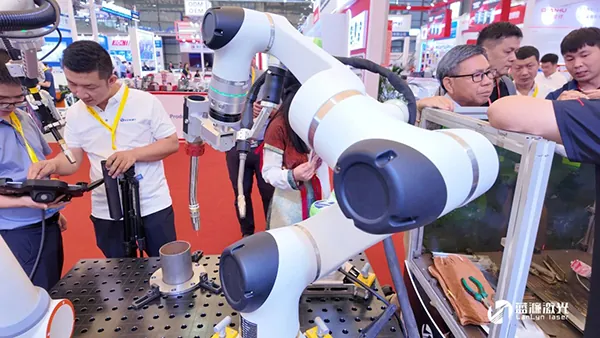 无锡洲翔现场展示了两款协作式焊接机器人应用,一是移动式焊接机器人工作站,演示立焊应用,它高度集成、配有磁吸底座,既可通过小车快速移动,抵近工件后也可单独挪动/抱动机械臂,灵活轻便;协作机器人+第七轴,则极大地扩展了焊接机器人的工作范围,实现复杂工件的协同精确焊接的同时减少机器人部署数量。