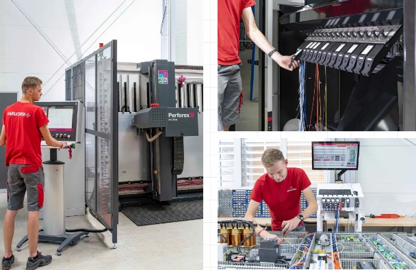 Perforex MT S生产加工好的金属部件,Secarex AC 18切割中心生产按长度切割并贴好标签的支撑轨、母线和导线槽。