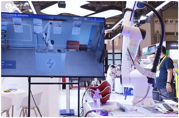 基于额定负载12KG的机械臂打造的协作型大臂展焊接机器人,凭借1.8米超长臂展,可在不挪位的情况下,触及更远的物体或焊接操作点,覆盖区域更广,焊接效率更高,可更轻松地应付大型框架、箱体、工程机械等庞然大物。现场还基于该展台,携手合作伙伴为汉科技共同打造了一款虚实一体的数字孪生机器人,可在专职高校实训中心广泛应用。
