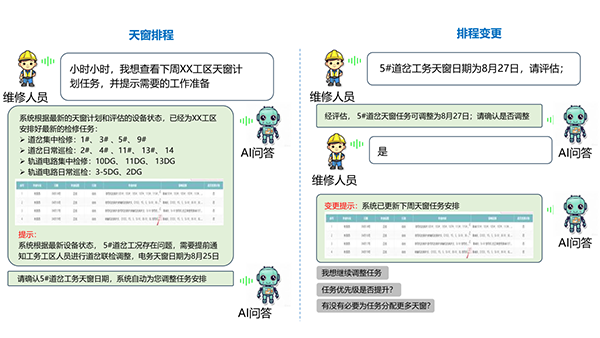 系统可根据关键设备实时工况智能调整作业流程。当信号工区需要制定道岔设备天窗检修计划时,大模型能综合历史检修数据与当前设备状态,自动优化作业安排,同步输出检修标准、技术要求和安全注意事项,实现精准排程。