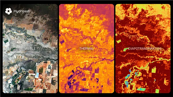 Hydrosat 卫星的热成像数据可以频繁、可靠地提供分区域尺度的洞察,并可用于植被健康评估、灌溉优化、农业用水效率测算、干旱预警等领域,同时也能监测工厂热排放、夜间船舶和其他热源识别、新建设施导致的毁林区域定位等商业与安防场景。