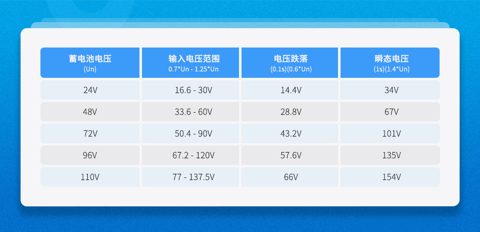 轨道交通蓄电池供电电压多样,包含24VDC、32VDC、36VDC、48VDC、64VDC、74VDC、87VDC、96VDC、110VDC电压。为了轨交设备中的电源归一化,开关电源在设计输入电压范围时需要考虑包含以下输入电压及电压波动情况,确保各子系统电力稳定供应。