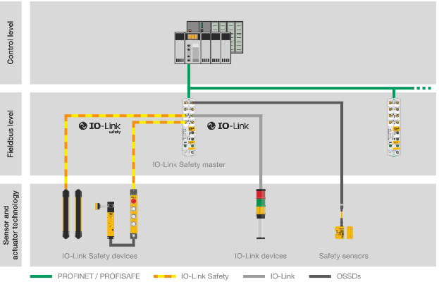 有了IO Link Safety协议后,安全传感器、安全执行机构厂家可以轻松地利用2线制原理将IO Link Safety协议集成在安全部件上。这些安全部件通过简易的2线制电缆连接到IO Link Safety Master站点后就能轻易地连入自动化网络中,例如PROFInet, EtherCAT等,这样的网络架构不会过多占用上层网络协议的站点数量—仅IO Link Safety Master站点会占用,也不会使得原有的安全部件价格成本大幅度提高。