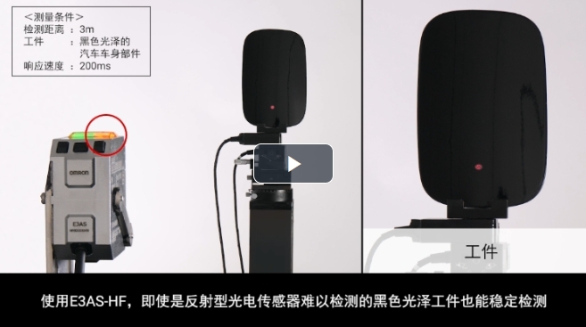即使在远距离倾斜安装环境下也能稳定检测黑色、蓝色等颜色的低反射率且带有光泽的工件。