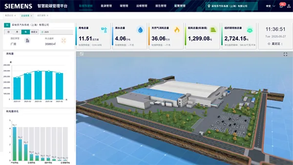 传统的厂区能耗管理模式多依赖人工,需借助能耗巡查员手动录入数据,效率较低且无法实现实时监控。为了让工厂完成数智化蜕变,西门子借助智慧能碳管理平台 Smart ECX 将物联网、云计算、大数据和人工智能等技术融合,嵌入 3D 建模,构建出能源数字孪生。整个厂区以 3D 动画的形式进行完整展现,对工厂的日常耗能、产线用能等进行实时采集、存储和分析。这一系列功能,不仅直观了解能源系统运行态势,让生产数据和能耗数据有效融合,让计算单品能耗成为可能,更能基于能源复合预测,帮助工厂的能源采购和排产进行决策参考,进行碳盘查便于未来制定减碳计划。