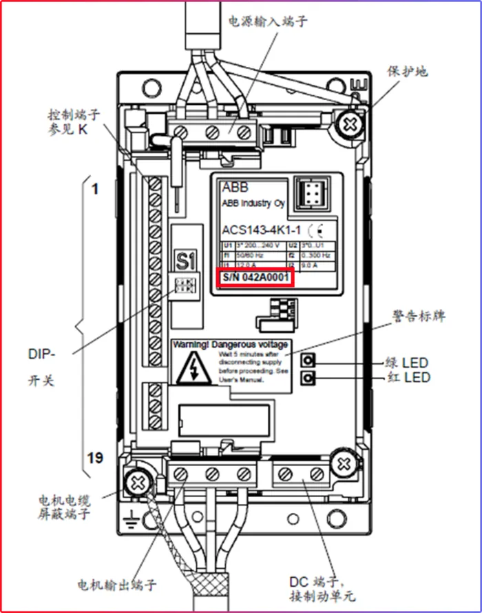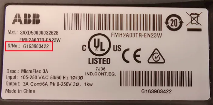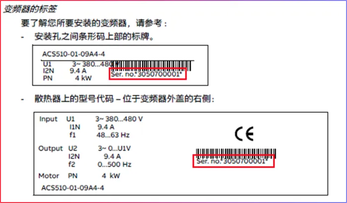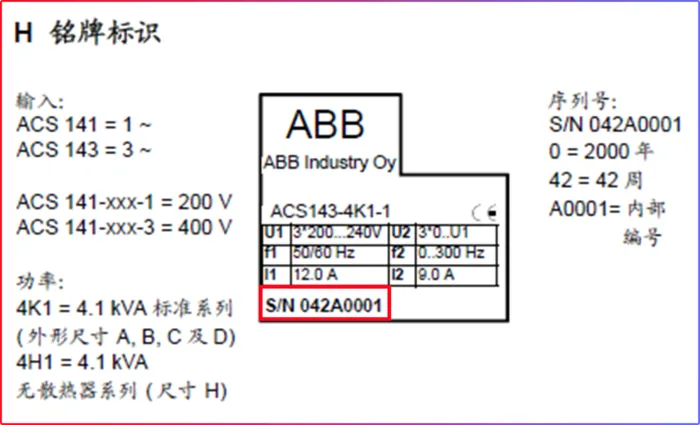 ACS510序列号说明:第1个数字3是制造工厂代码,第2、3位代表制造年份(例如:上图中示例序列号中的05代表2005年),4、5位代表制造周次,后5位代表生产序列号,从00001开始计数。