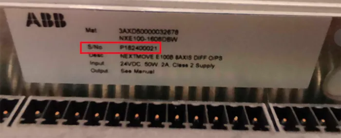 · E100系列(MotiFlex E100、MicroFlex E100、NextMove E100)序列号一般都在模块本体上,是一串数字代码。E100系列序列号含义如下:第1位是制造工厂代码,第2、3位代表制造年份,第4、5位代表制造周次,剩余数字代表生产序列号。