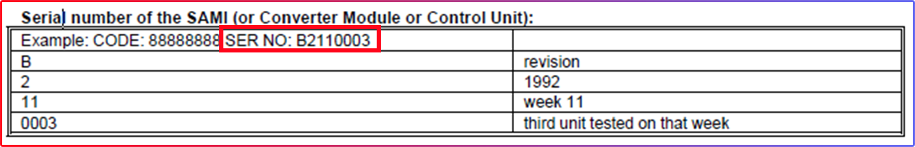· SAMI GS系列(ACS500、ACS501、ACS502、ACS503、ACS504)各部件上都有铭牌,除了部件或单元的代码和型号外,铭牌上还印有序列号。SAMI(或变流器或控制单元)序列号说明:以序列号B2110003为例,2代表 1992年,11 代表第11周,0003 代表本周的第3个合格单元。