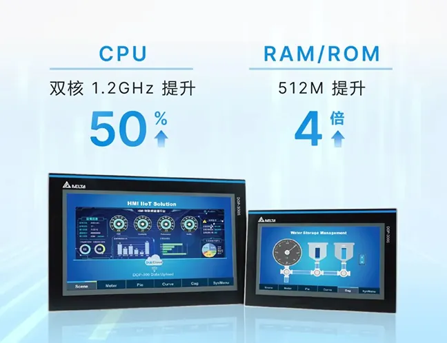 DOP-300S采用双核1.2GHz高性能处理器,运算能力较上一代提升50%;512M RAM/ROM,存储能力提升4倍,轻松应对复杂控制逻辑与海量数据运算。