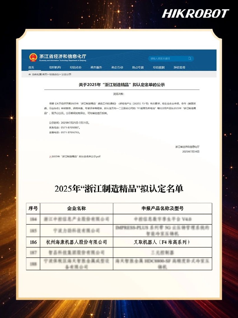 近日,浙江省经济和信息化厅发布《关于2025年“浙江制造精品”拟认定名单的公示》,海康机器人“叉取机器人(F4堆高系列)”凭借卓越的技术创新能力和产品性能成功入选。