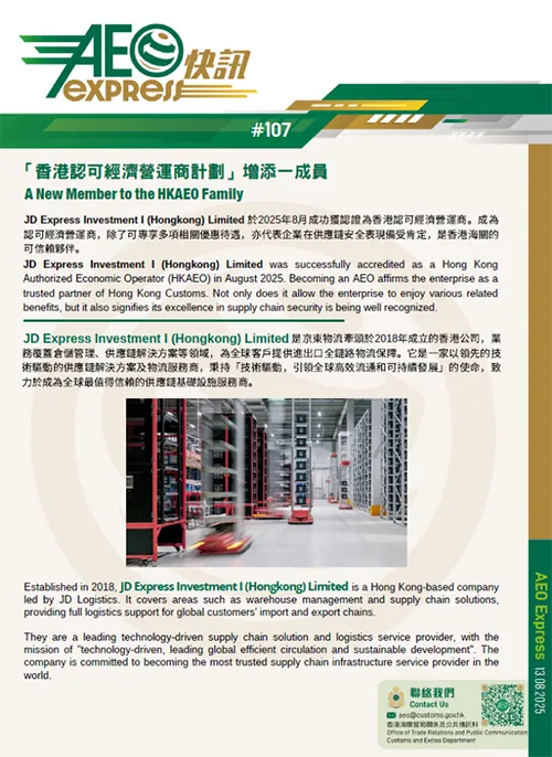 AEO(全称Authorized Economic Operator,中文译名为“经认证的经营者”,香港称作“认可经济营运商”) 是世界海关组织《全球贸易安全与便利标准框架》中的核心制度,旨在通过海关与海关、海关与商界以及海关与其他政府部门的合作,促进全球供应链安全与贸易便利化,实现关企互利共赢、贸易畅通。获得该认证的企业,在进出口清关等环节将享受诸多便利,如优先清关、较低查验率等。此次京东物流旗下JD Express Investment获香港海关AEO认证,将进一步提升其在香港地区进出口物流服务的效率与可靠性。