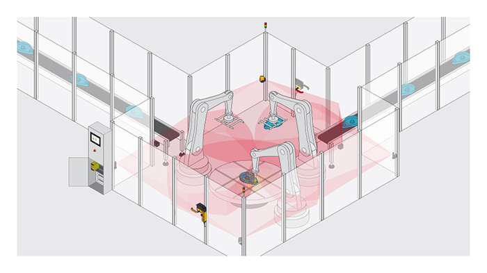 PSENmgate适用于机器人单元等需要频繁进出的场景。其集成操作元件和把手的设计,为用户提供了一站式安全解决方案,同时通过串联连接节省控制器输入和输出资源。