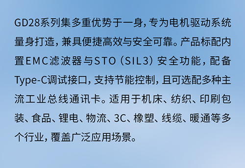 GD28系列是一款集多种优势于一身的灵巧型通用变频器,旨在为您的电机驱动系统提供卓越的解决方案。产品安全可靠、结构紧凑、性能优异、功能丰富、简单易用;GD28产品内置EMC滤波器及安...
