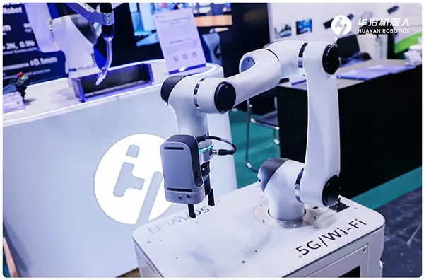 除了自动化焊接,华沿机器人也带来了可在跨区搬运、上下料、分拣等场景中应用的移动式机器人系统,它将高精度、高稳定性的Elfin、Elfin-Pro系列协作机器人化作智能化的“手”,并与AGV/AMR、第七轴地轨等设备无缝集成,实现“手脚并用”。与此同时,还可以进一步基于AI、大数据、工业视觉及激光雷达等能力,让机器人更加灵活、更加智能。目前,这款移动式机器人系统已在华为云“自主垃圾清除机器人”方案、华为云Embodied Al Factory解决方案等应用。