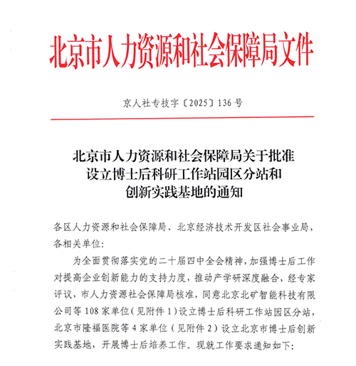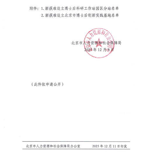 【信息来源】北京市人力资源和社会保障局《关于批准设立博士后科研工作站园区分站和创新实践基地的通知》(京人社专技字〔2025〕136号)