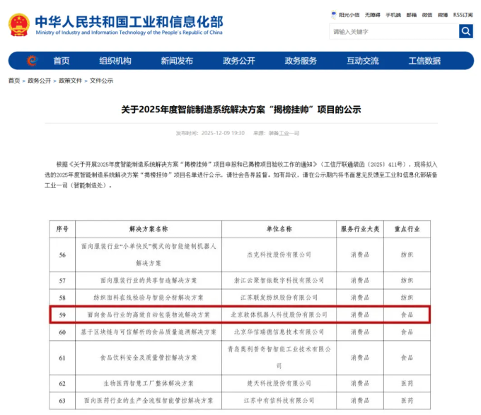 近日,工业和信息化部发布了《2025年度智能制造系统解决方案“揭榜挂帅”项目公示名单》,由北京软体机器人科技股份有限公司(以下简称“SRT”)申报的 “面向食品行业的高效自动包装物流解决方案” 成功入选。